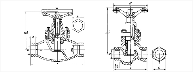 閥體長度 | 接頭長度 | 接頭長度 | 手輪直徑 | 管螺紋 G | 關閉高度 | 開啟高度 | 重量 | |